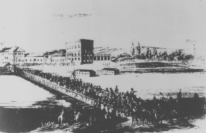 (Truppen überqueren den Rhein) Steindruck nach einem Aquarell von Fr. Kaiser